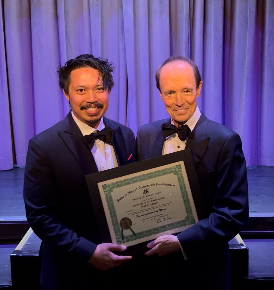 With that confident boosting and inspirational magic show, Michael Nguyen opted to study stage magic and theater from the Chavez Studio of Magic in 2022. That same year, never performing on stage, took a chance and entered the Oakland Magic Circle Stage Magic Competition and won. With the publicity winning the contest, Michael Nguyen started getting a flood of emails and more magic work.