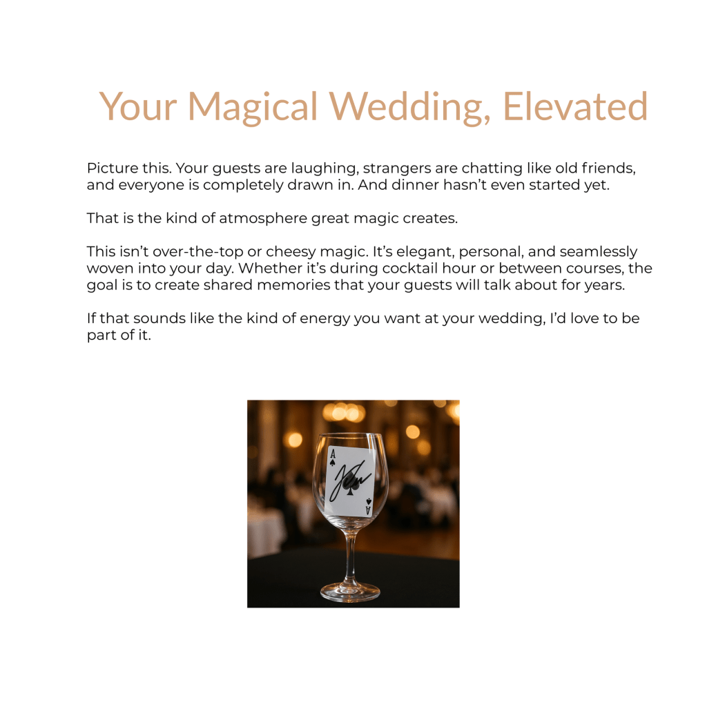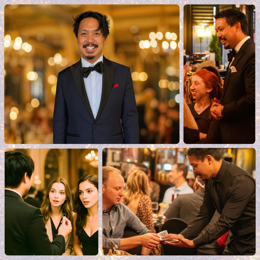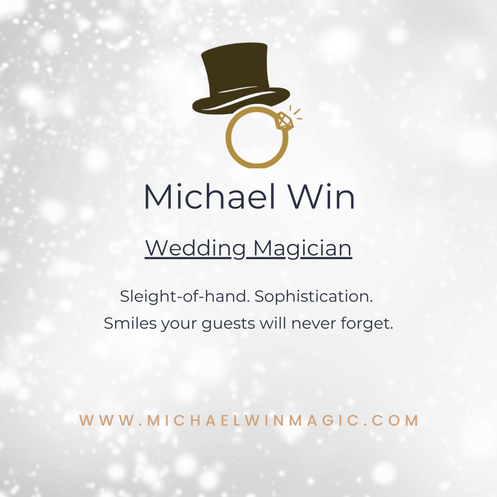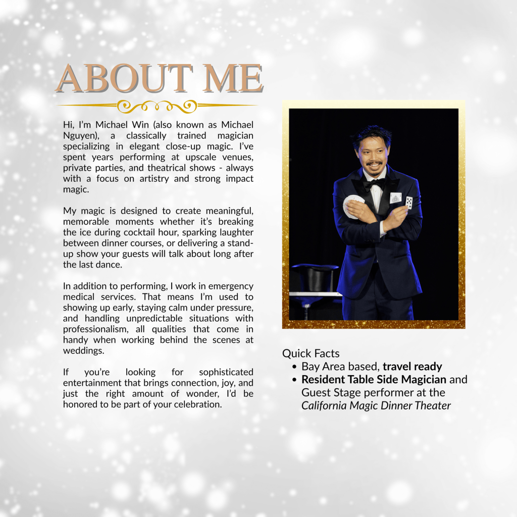Hi, I’m Michael Win (also known as Michael Nguyen), a classically trained magician specializing in elegant close-up magic. After years of performing at upscale venues, private parties, and theatrical shows, I bring that same level of artistry and impact to weddings.