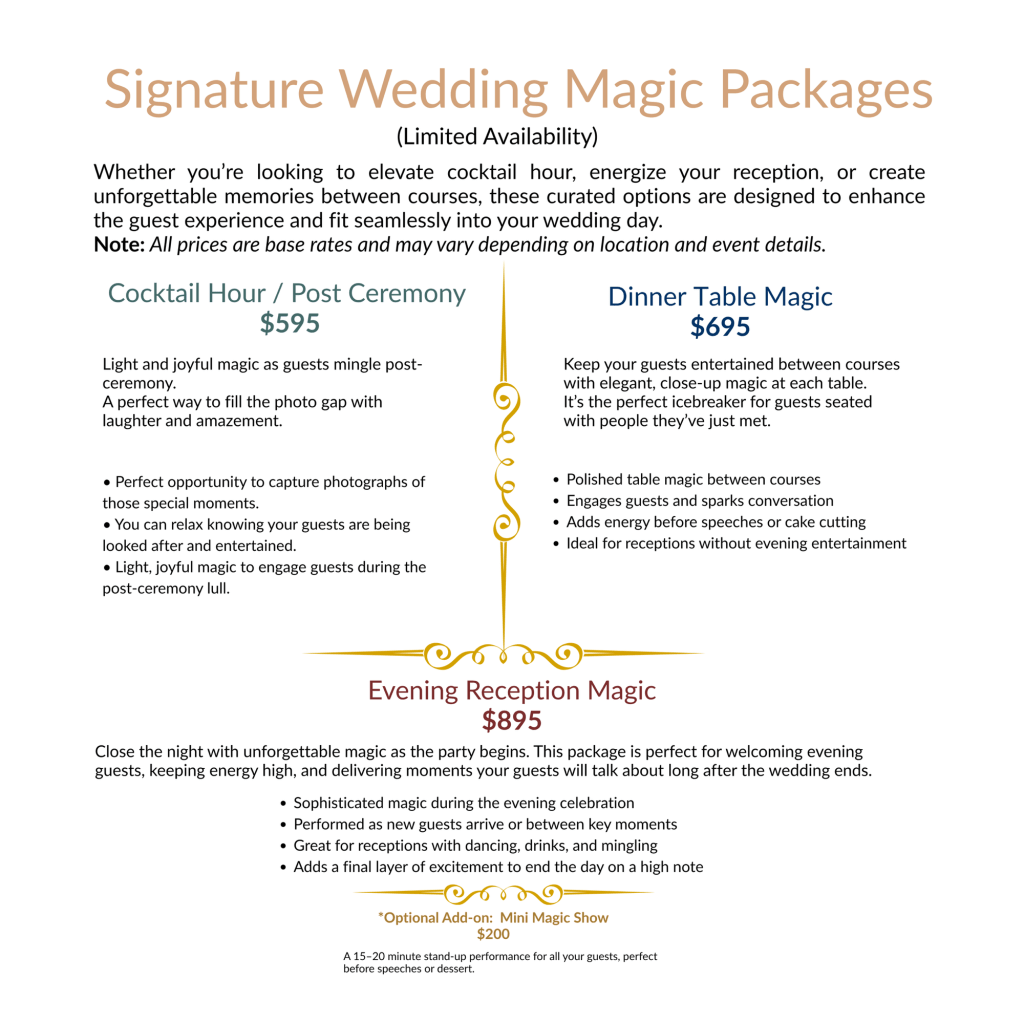 • Light, joyful magic to engage guests during the post-ceremony lull.